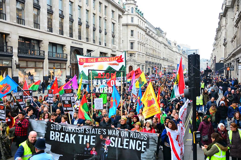 Sunday 6th of March saw the first national demonstration in solidarity with the Kurdish struggle in the Middle East. The demo called for the Turkish state to stop its war on the Kurds in both Bakur (South-East Turkey) and over the border in Rojava (the autonomous northern region of Syria which has seen a Kurdish led social revolution). Between eight and ten thousand people gathered in London to support this demand, marching from BBC Broadcasting House to Trafalgar square. It was loud, vibrant, colourful and angry.