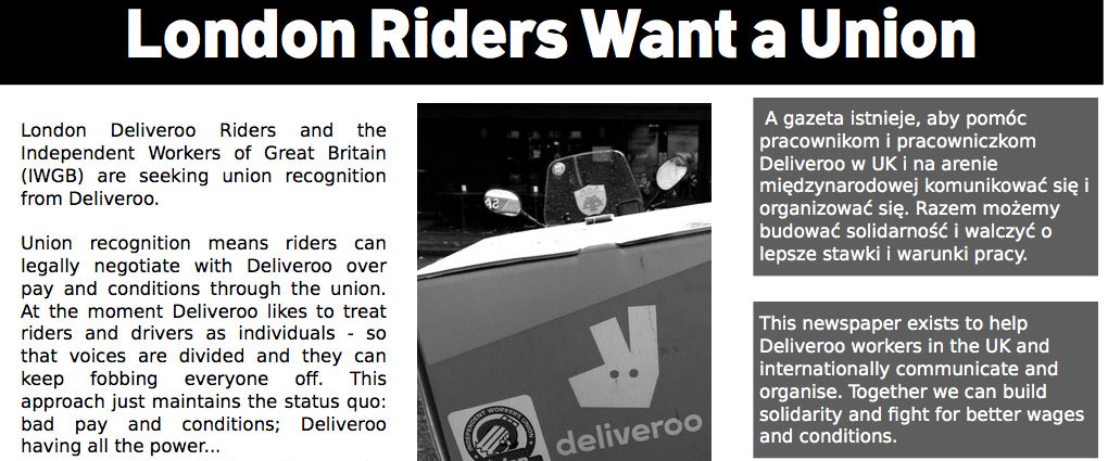 This December issue of the Deliveroo Workers' bulletin contains updates from London, Brighton, Berlin and Italy as well as information on how to get in touch with union-building projects currently being led by the Industrial Workers of the World and the Independent Workers of Great Britain.